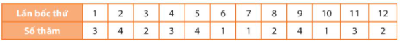 b) Trong hộp có 4 lá thăm bằng giấy có kích thước giống nhau được đánh số từ 1 đến 4. Đến lượt mình, mỗi bạn trong nhóm bốc một lá thăm, xem số rồi trả lại hộp. Kết quả các lần bốc thăm được ghi lại ở bảng sau: