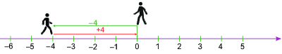 Di chuyển sang phải 4 đơn vị là \(\left( { + 4} \right)\), sang trái 4 đơn vị là \(\left( { – 4} \right)\). Người đó dừng lại tại điểm 0 nên: \(\left( { + 4} \right) + \left( { – 4} \right) = 0\)