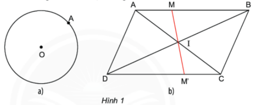 a) Lấy một điểm A bất kì trên đường tròn tâm O. Hãy tìm điểm B trên đường tròn sao cho O là trung điểm của đoạn thẳng AB (Hình 1a). b) Cho hình bình hành ABCD, hai đường chéo AC và BD cắt nhau tại I. Đường thẳng qua I cắt AB tại M và cắt CD tại M. Đo rồi so sánh độ dài IM và IM (Hình 1b).
