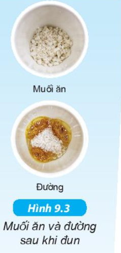 – Cho 3-5 thìa muối ăn vào bát sứ thứ nhất, 3-5 thìa đường vào bát sứ thứ hai. Đun nóng hai bát. Khi bát đựng muối có tiếng nổ lách tách thì ngừng đun. Khi bát đựng đường có khói bốc lên thì ngừng đun.