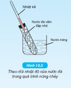 Tiến hành: Cho nước đá viên đập nhỏ vào ống nghiệm. Cắm nhiệt kế vào giữa khối nước đá. Đặt ống nghiệm vào cốc thủy tinh có chứa nước nóng.