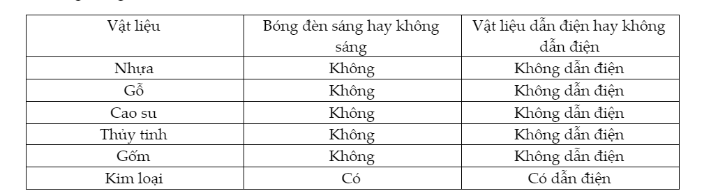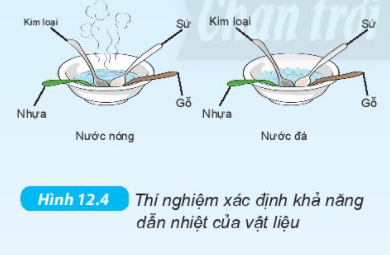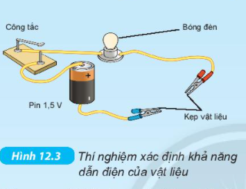 1. Tìm hiểu về khả năng dẫn điện của vật liệu Chuẩn bị: bộ dụng cụ như sơ đồ ở hình 12.3, một số đồ vật làm bằng kim loại, nhựa, gỗ, cao su, thủy tinh, gốm.. Hãy quan sát hiện tượng khi thực hiện thí nghiệm và điền kết quả quan sát được theo mẫu bảng sau: 2. Tìm hiểu khả năng dẫn nhiệt của vật liệu Chuẩn bị: bát sứ, các thìa bằng kim loại, sứ, nhựa, gỗ