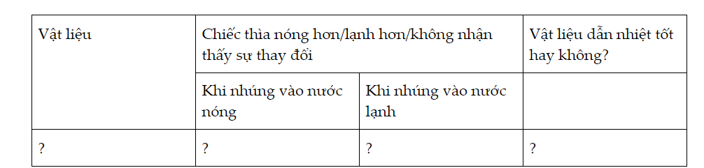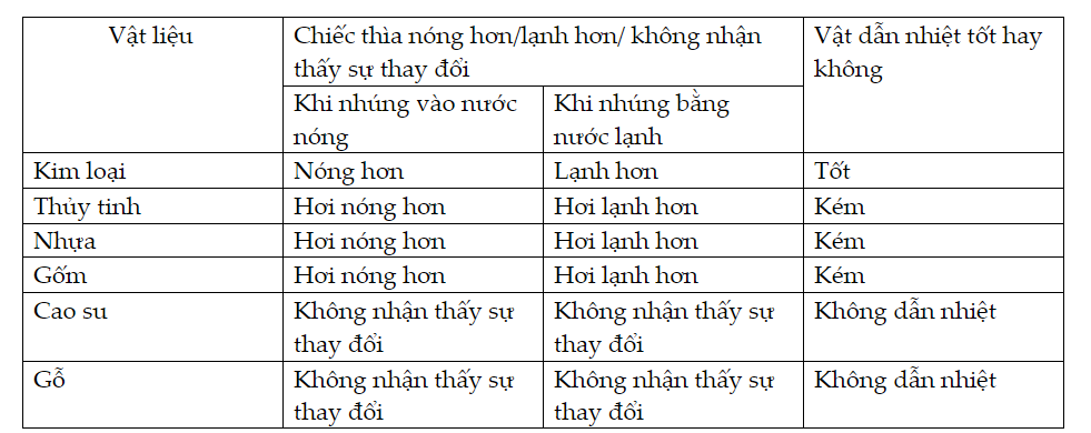 Hãy nhận xét sự thay đổi nhiệt độ của các loại thìa. Điền kết quả quan sát, nhận xét theo mẫu bảng sau:
