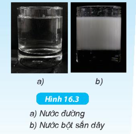 1. Nước đường và nước bột sắn dây không cùng trong suốt, nước đường thì trong suốt, tuy nhiên nước sắn dây có màu trắng đục. Do đó cố nước đường là dung dịch, cốc nước sắn dây là huyền phù.