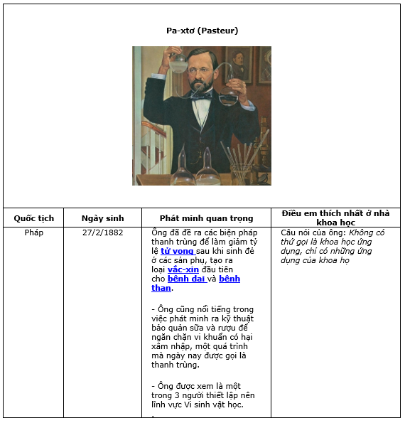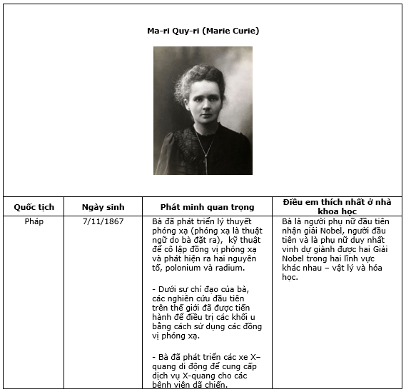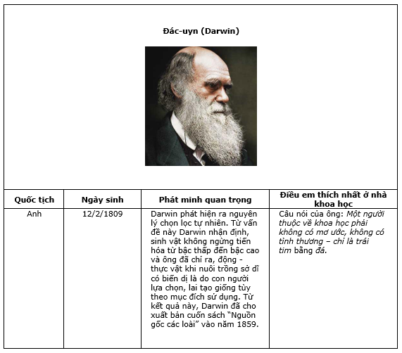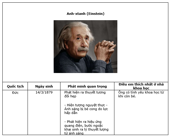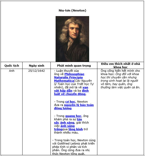 Hãy cùng các bạn trong nhóm học tập phân công mỗi người tìm đọc tiểu sử của một trong năm nhà khoa học nổi tiếng dưới đây, rồi viết tóm tắt về quốc tịch, ngày sinh, phát minh quan trọng và điều mà em thích nhất ở nhà khoa học đó: 1. Niu-tơn, 2. Đác-uyn, 3.Pa-xtơ, 4. Ma-ri Quy-ri, 5. Anh-xtanh.