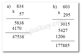 Tính: a) 834 . 57, b) 603 . 295
