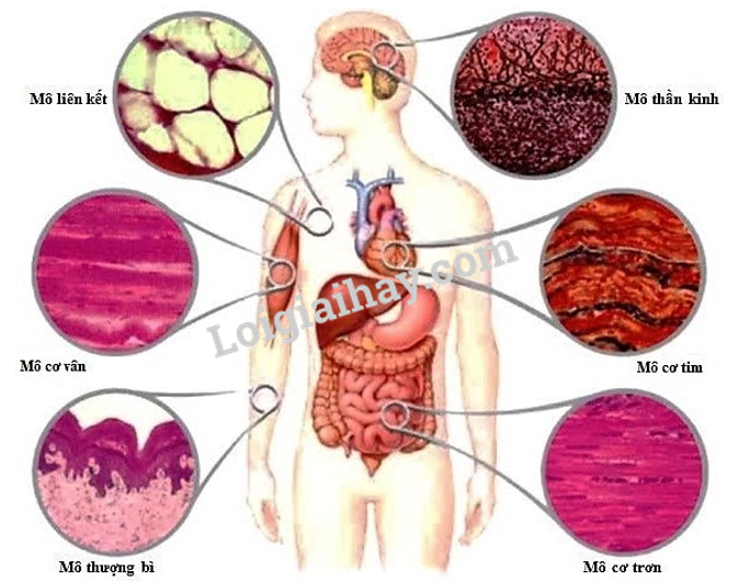 – Cơ thể con người được cấu tạo nên từ những loại mô như: mô cơ, mô thần kinh, mô liên kết, mô biểu bì.