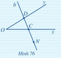 Cho góc xOy và điểm N không nằm trong góc đó. Giả sử đường thẳng b đi qua N lần lượt cắt tia Ox, Oy tại C, D (Hình 76). Nêu vị trí của điểm N đối với hai điểm C, D.