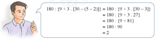 Thầy giáo hướng dẫn học sinh tính giá trị của biểu thức \(180:\left\{ {9 + 3\left[ {30 – \left( {5 – 2} \right)} \right]} \right\}\) như sau: