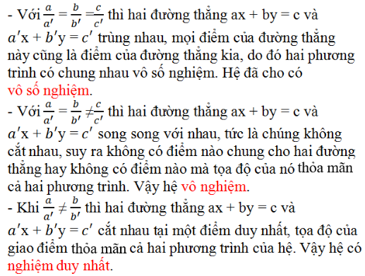 + Vô nghiệm nếu \(\dfrac{a}{{a’}} = \dfrac{b}{{b’}} \ne \dfrac{c}{{c’}}\)