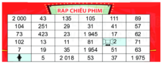 Bạn Hà đang ở ô tìm đường đến phòng chiếu phim 2. Biết rằng chỉ có thể đi từ một ô sang ở chung cạnh có chứa số nguyên tố. Em hãy giúp Hà đến được phòng chiếu phim nhé.