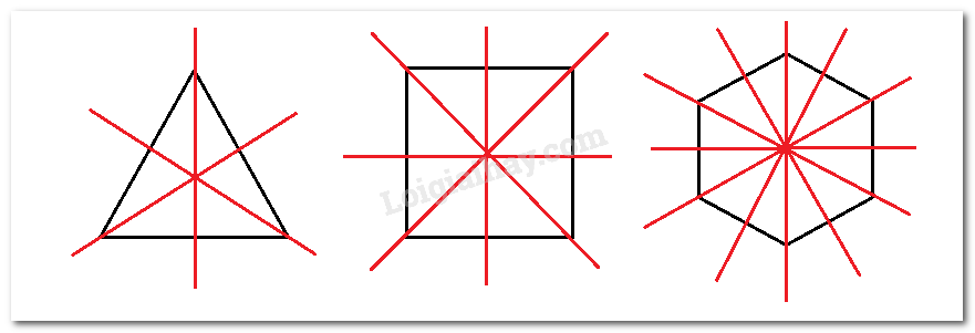 2. Làm tương tự như hoạt động 6 với tam giác đều, hình vuông, lục giác đều. Em hãy chỉ ra một trục đối xứng của mỗi hình trên.