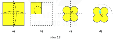 Gấp đôi tờ giấy hai lần theo hình 5.8a. Cắt tờ giấy vừa gấp theo một đường như hình 5.8b Mở phần cắt được ra ta có một hình bông hoa bốn cánh (1.5.8c).Gọi giao điểm của hai nếp gấp là O. Cố định điểm O bằng đinh ghim để có thể quay hình đó quanh 0. Bằng cách quay hình nửa vòng quanh O, em hãy kiểm tra xem điểm O có phải là tâm đối xứng của hình không.