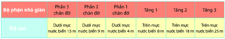 b) Một nhà giàn DK1 trên vùng biển Đông của Việt Nam có 3 tầng trên mặt nước và 3 phần hệ thống chân đỡ có độ cao như sau: