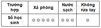 Một cuộc điều tra về vệ sinh trường học cho thấy có 50 học sinh có sử dụng xà phòng rửa tay, 30 học sinh chỉ rửa tay bằng nước sạch, 10 học sinh không rửa tay trước khi ăn.
