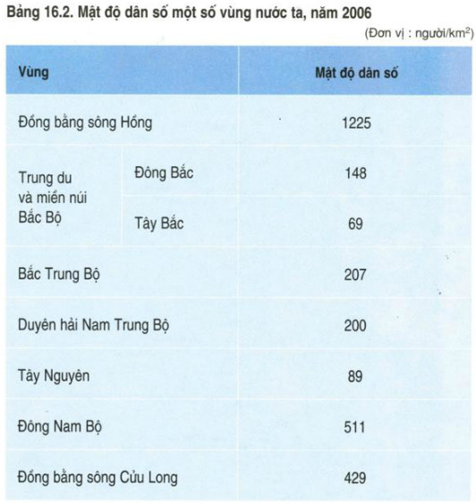 Từ bảng 16.2, hãy so sánh và nhận xét về mật độ dân số giữa các vùng.