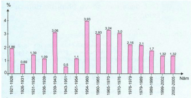 + Giai đoạn năm 1921 – 1954 :Tỉ lệ gia tăng dân số nhìn chung thấp (trung bình <2%), do đây là thời kì chiến tranh ở nước ta.