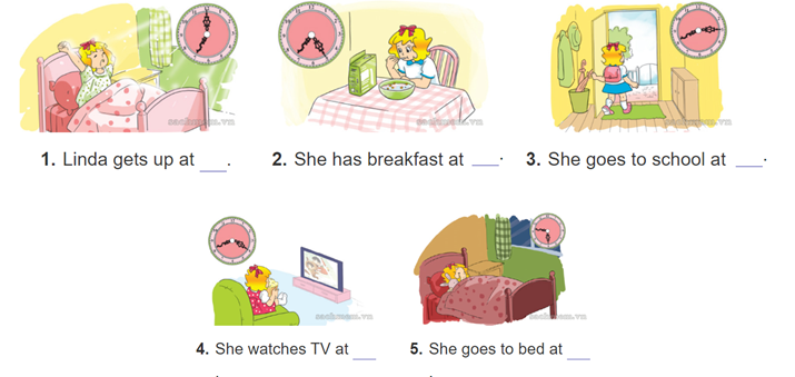 Hello. My name is Nam. I study at Nguyen Du Primary School. Every day I get up at (1) ______. I (2) ______ at seven fifteen. School starts at seven thirty in the morning and finishes at four thirty in the afternoon. I go home at (3) ______. After dinner, I (4) ______ or listen to music. I (5) ______ at nine forty-five.