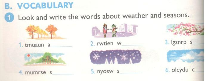 1. Look and write the words about weather and seasons.