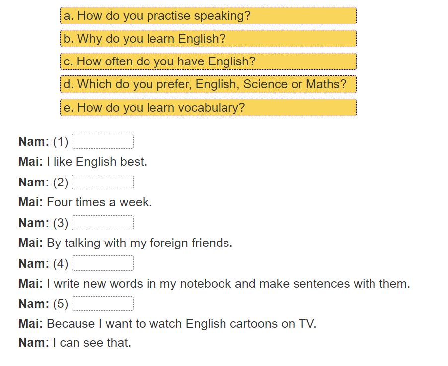 Mai: I like English best. (Tớ thích Tiếng Anh nhất.)