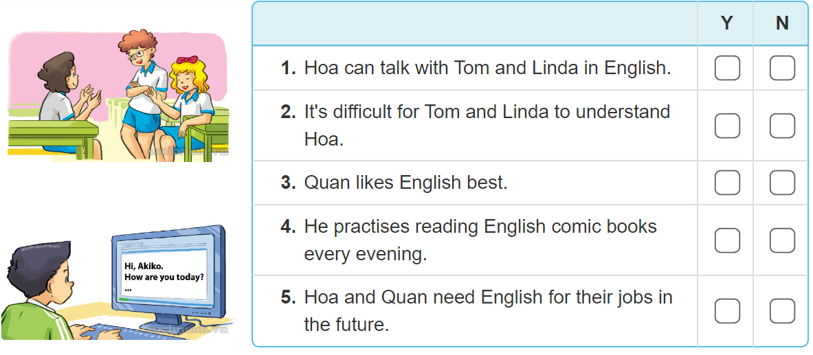 1 Y Hoa có thể nói chuyện với Tôm và Linda bằng Tiếng Anh.