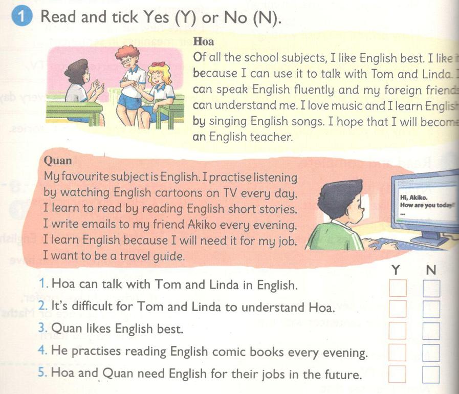 Hoa: Trong số tất cả các môn học ở trường, tớ thích môn Tiếng Anh nhất. Tớ thích môn đó vì tớ có thể sử dụng nó để nói chuyện với Tôm và Linda. Tớ có thể nói Tiếng Anh trôi chảy và những người bạn nước ngoài của tớ có thể hiểu được tớ. Tớ yêu thích âm nhạc và tớ học Tiếng Anh bằng việc hát các bài hát bằng Tiếng Anh. Tớ hy vọng rằng tớ sẽ trở thành một cô giáo Tiếng Anh.