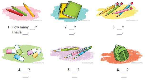 (Bạn có bao nhiêu cây bút chì màu? – Tớ có 5 cây.)