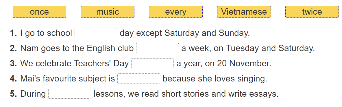 It is Wednesday today. Trung is at (1) _____. He has four lessons: Vietnamese, Maths, English and (2) _____. Trung has English four times a (3) _____. Miss Hien is his English teacher. She is a kind and (4)  _____ teacher. English is one of Trung’s (5)  _____ subjects because he loves reading English short stories and comic books. Trung also likes (6)  _____ online with his foreign friends like Akiko, Tony, Linda and Peter.