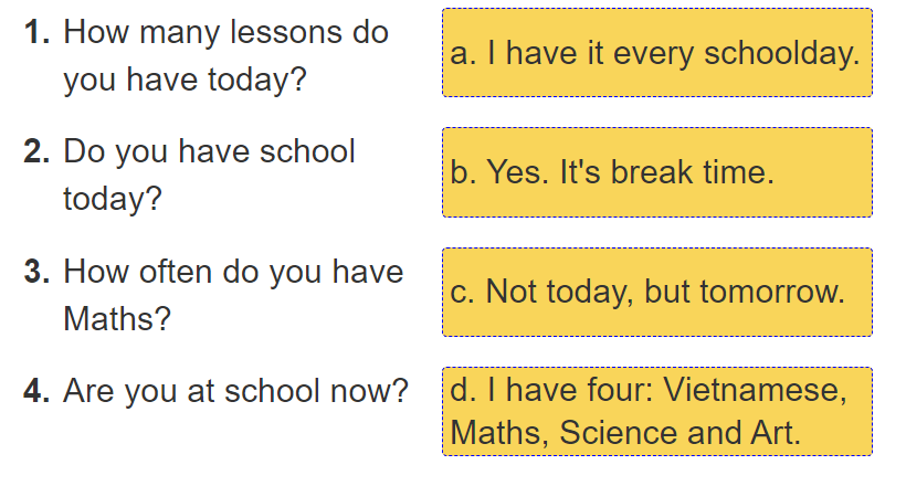How many lessons do you have today? – I have four: Vietnamese, Maths, Science and Art.