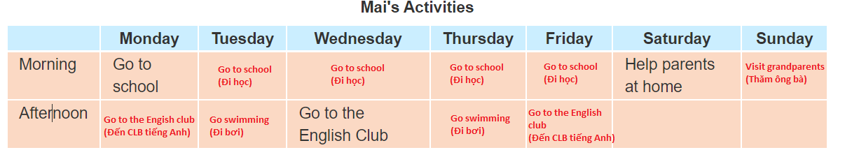Hello. I am Mai. I go to school every morning from Monday to Friday. On Monday, Wednesday and Friday afternoons, I go to the English Club. On Tuesday and Thursday afternoons, I go swimming. I do not go to school at the weekend. On Saturdays, I help my parents at home. On Sundays, I visit my grandparents with my parents.
