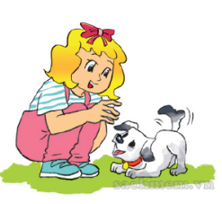 (Cậu ấy đang chơi với chú cún của cậu ấy.)