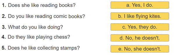1. Does she like reading books? (Cô ấy có thích đọc sách không?)