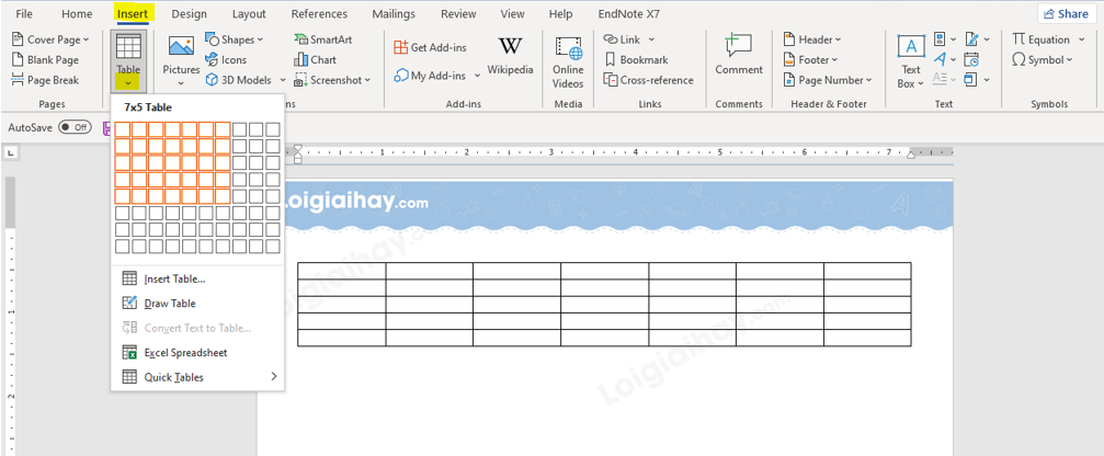 + Bước 1: Chọn Insert => Nháy chuột vào mũi tên bên dưới Table => Di chuyển chuột để chọn 7 cột và 6 hàng => Nháy chuột trái.