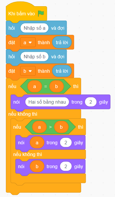 Em hãy vẽ sơ đồ khối mô tả thuật toán tìm số lớn hơn trong hai số a và b. Từ sơ đồ khối, hãy viết chương trình Scratch thực hiện thuật toán.