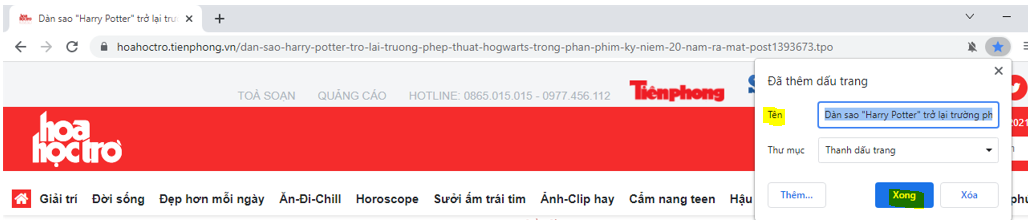 + Nhấn vào biểu tượng dấu sao bên phải, phía bên trên màn hình => Chọn “Thêm dấu trang”.