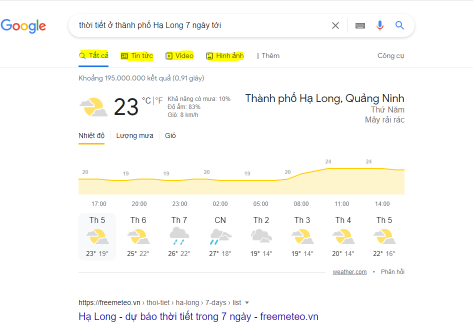 – Bước 2: Nhập từ khóa tìm kiếm thời tiết ở thành phố Hạ Long 7 ngày tới rồi nhấn phím Enter.