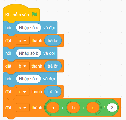Chương trình Scratch thực hiện thuật toán tính trung bình cộng của ba số: