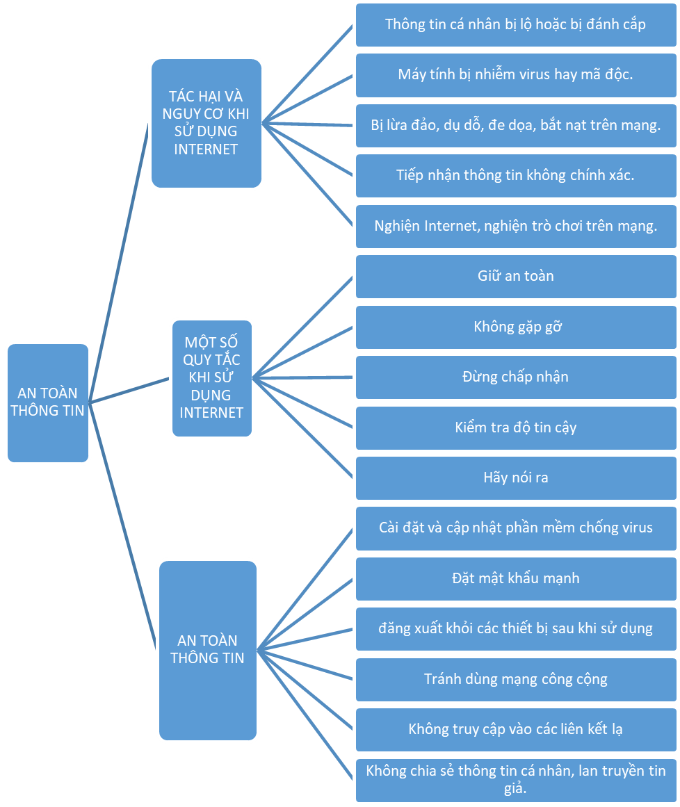 Em hãy dùng sơ đồ tư duy (vẽ trên giấy hoặc tạo bằng phần mềm) trình bày tóm tắt nội dung Bài 9. An toàn thông tin trên Internet.