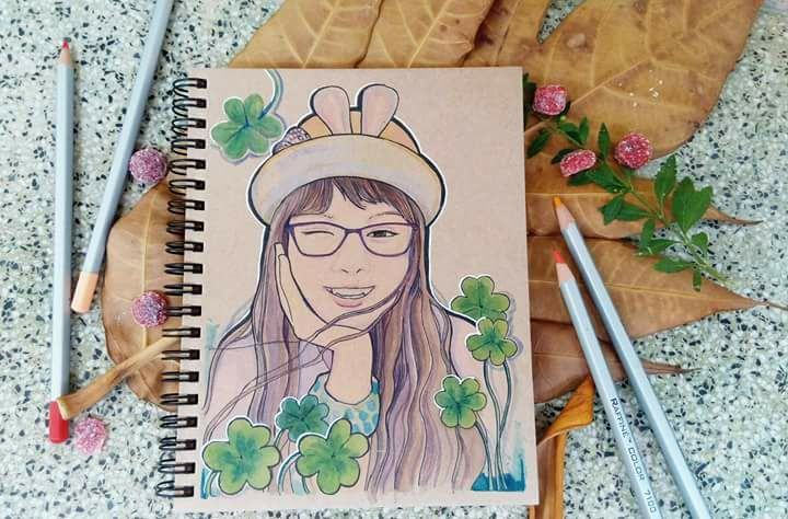 em thiết kế sổ tặng cô giáo em, trên bìa sổ là chân dung em vẽ tặng cô