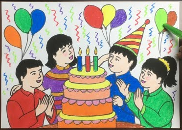 Em vẽ khung cảnh sinh nhật của gia đình em, vì đang trong mùa dịch nên chỉ tổ chức trong gia đình