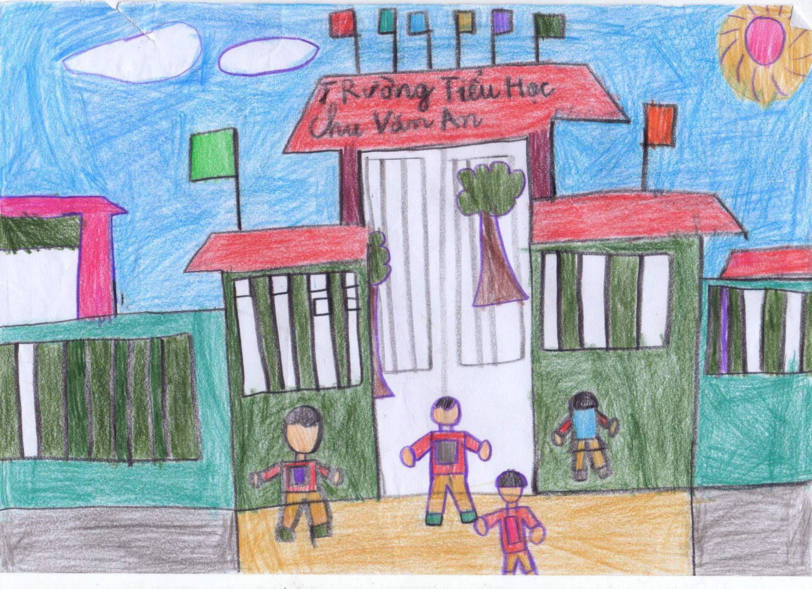Em vẽ tranh cổng trường em vào giờ học sinh bắt đầu vào lớp