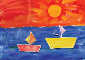 Vẽ và cắt dán thêm thuyền, mây….để bức tranh mặt trời và biển sinh động hơn