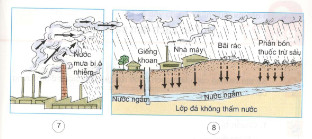 +Hình 8: Hình vẽ khí thải từ các nhà máy làm ô nhiễm nước mưa. Chất thải từ nhà máy, bãi rác hay sử dụng phân bón, thuốc trừ sâu ngấm xuống mạch nước ngầm làm ô nhiễm mạch nước ngầm.
