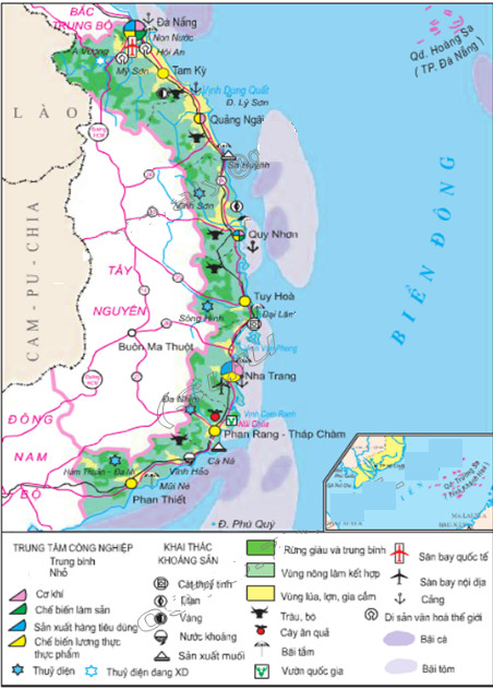 – Các thành phố: TP. Đà Nẵng (góc phía Đông bắc của vùng), Quy Nhơn (tỉnh Bình Định), Nha Trang (tỉnh Khánh Hòa).